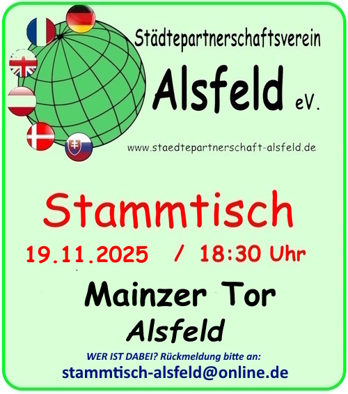 19.11.2025 28. Oktober 2025 Hans-Georg Braun Termine Anstehende Veranstaltungen Feb. 19 18:30 - 21:00 Stammtisch Akropolis März 18 08:00 - 21:00 Stammtisch Apr. 15 18:30 - 21:00 Stammtisch Mai 20 18:30 - 21:00 Stammtisch Mai 27 27 Mai - 3 Juli Schüler aus Chaville in Alsfeld Kalender anzeigen Ratshausmodel von Patrick Kosog